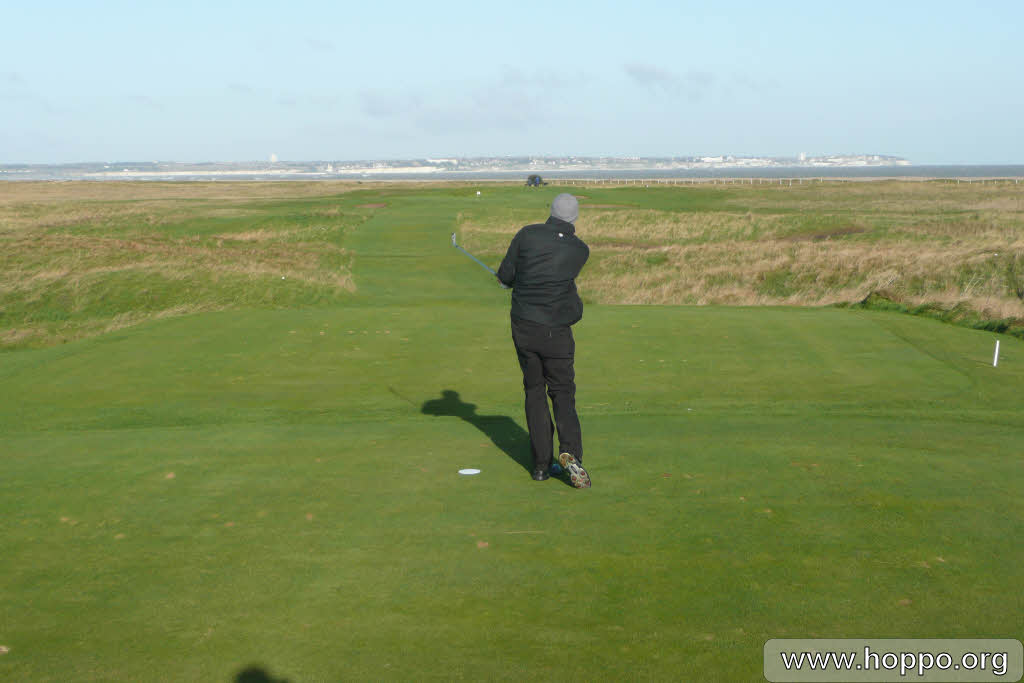 > Tim tees off towards the sea.